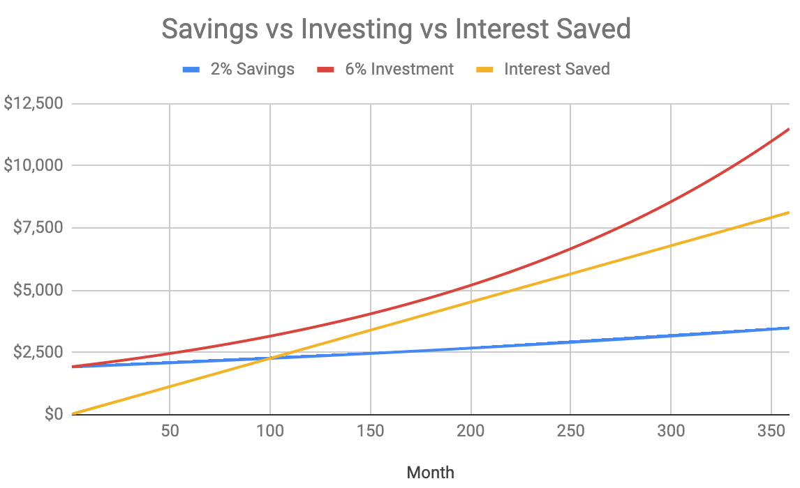 Is it worth paying $1917 now to save $22.64 per month? In my opinion… No, it’s not usually worth it. It takes 7 years before you’ve made up the extra cost. If you put the $1917 into a a savings account with 2% APY, it takes 8.5 years. Will you even own the house for that long? Will rates drop and cause you to want to refinance? If you invest the $1917 and get a 6% (or anything above 3.875%) return, you’ll certainly be better off taking the $1917. Below shows the growth of your cash vs savings over the life of a 30 year loan.